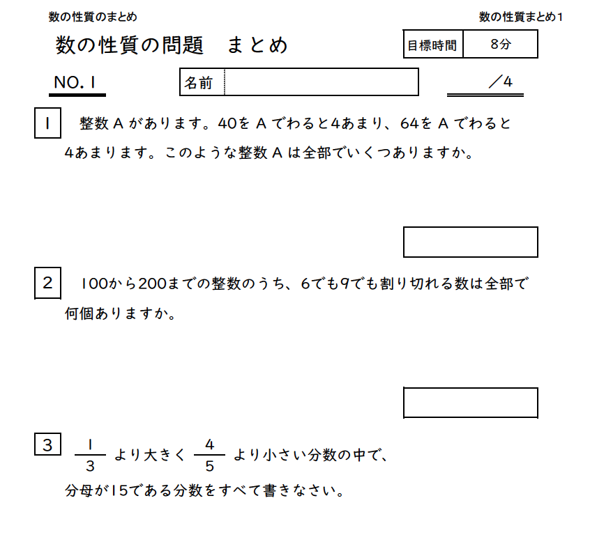 - : 倍数、約数、素数、公倍数、公約数などの基本的な意味をしっかり復習