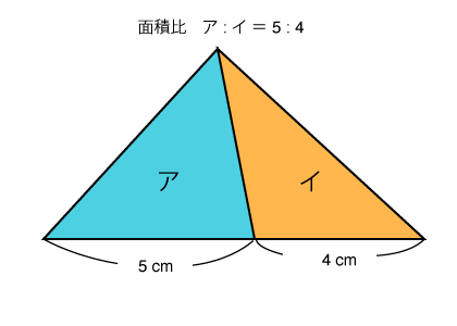 例)下の図のように、1つの三角形の中を線で分けたとき、底辺の比が 5 : 4 なら面積比も 5 : 4 になります。
