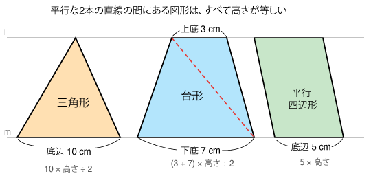 下の図のように、平行な2本の直線の間にある図形は、すべて高さが等しくなります。
