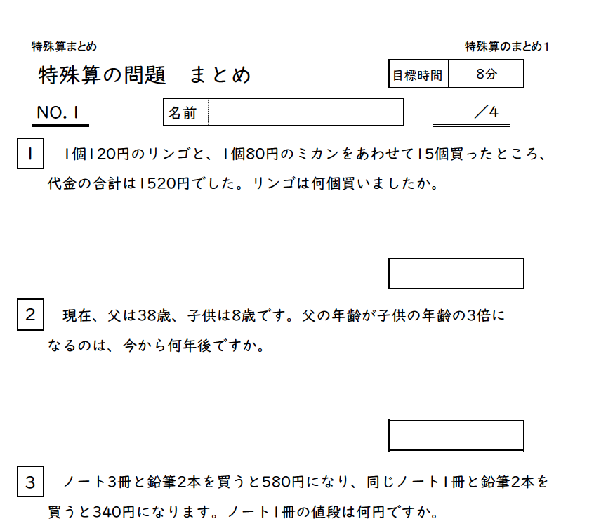つるかめ算、消去算、過不足算、差集め算、年齢算、平均算、分配算、和差算、倍数算、集合算、ニュートン算、植木算、還元算などの特殊算のまとめの問題プリントです。