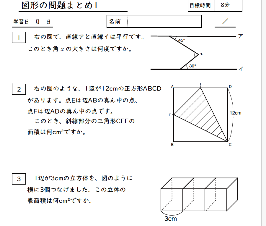 - 図形の問題は解き方を素早く判断することが大切です。問題を見てすぐに解き方が思い浮かぶように練習してください。
