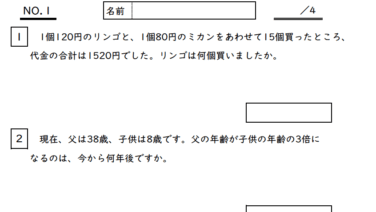 中学受験算数まとめ 中学受験 特殊算のまとめ つるかめ算、消去算、過不足算、差集め算、年齢算、平均算、分配算、和差算、倍数算、集合算、ニュートン算、植木算、還元算などの特殊算のまとめの問題プリントです。入試直前の確認、模擬テスト前の確認、6年生の夏休みの学習などに利用してください。学習... 2025.12.29 中学受験算数まとめ特殊算算数